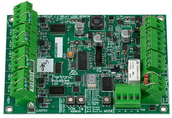The Multi-Function Loop Responder can handle a mix of inputs from conventional detection zones and switches. A board-mounted rotary switch provides a range of optional modes, including a “4- zone + 4-switch” option that allows four of the eight inputs to monitor conventional zones, while the other four inputs connect to isolated switch contacts. The rotary switch has positions for NZS 4512:2010 or NZS 4512:1997 zones.