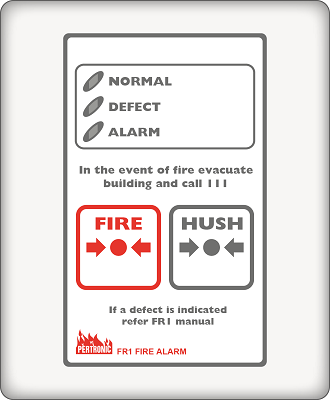 The FR1’s front-panel “Fire” button works like a manual call point. If you want everyone to get out immediately, press that red button. Sounders can be silenced by pressing the grey “Hush” button.
